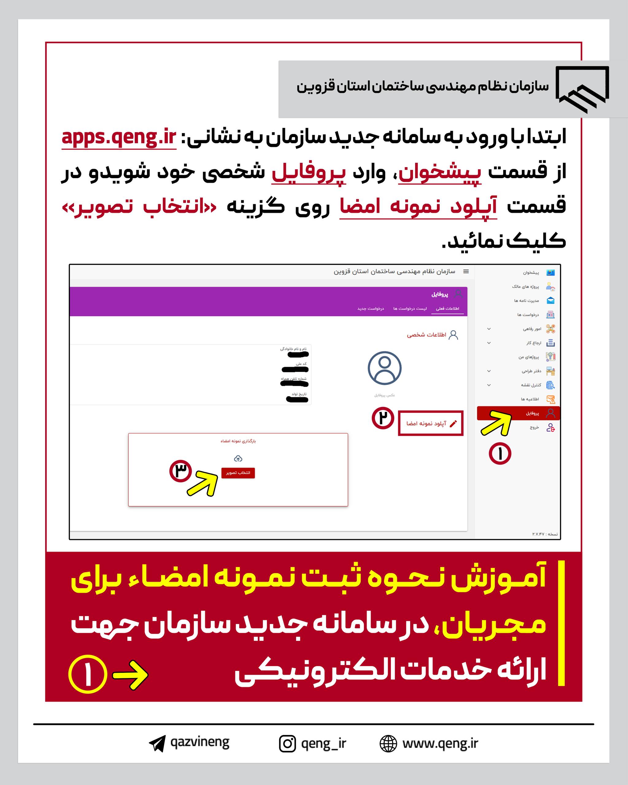 بر اساس اعلام سازمان، پیشنیاز استفاده از این سامانه بارگذاری نمونه امضای مجریان و سرپرستان کارگاه در سامانه جدید سازمان، به آدرس: apps.qeng.ir/dashboard است.